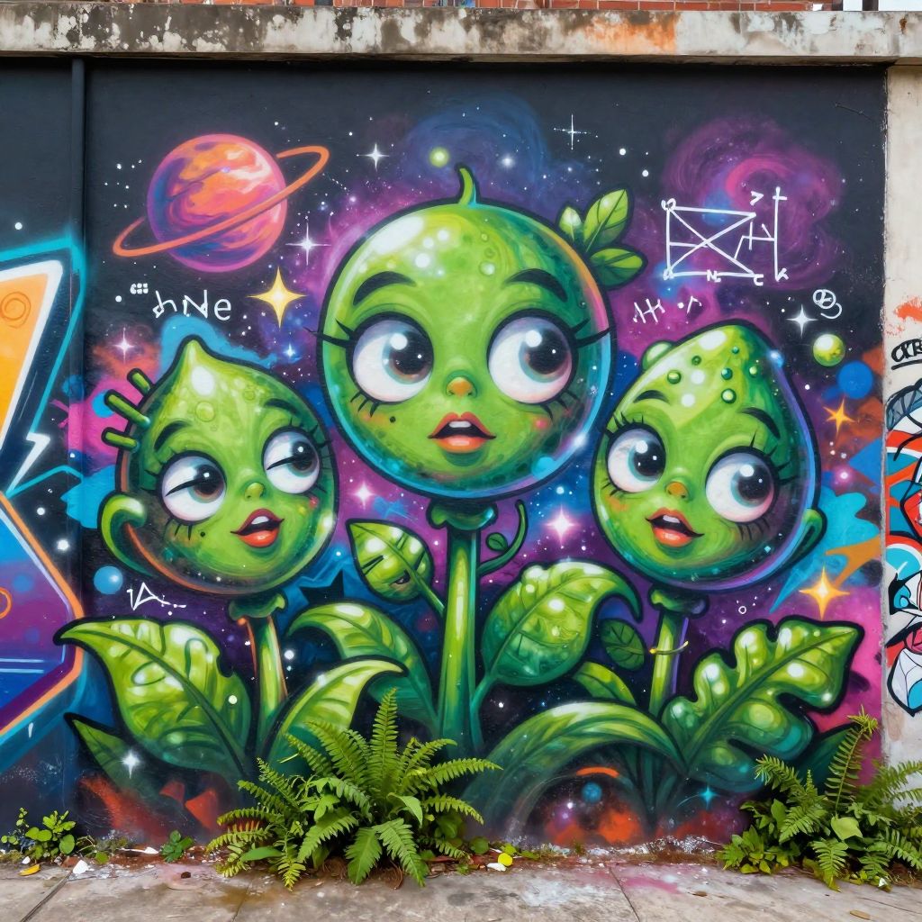 Vibrant graffiti of three green, cartoonish alien plants with large eyes and leaves, set against a cosmic background with planets, stars, and mathematical