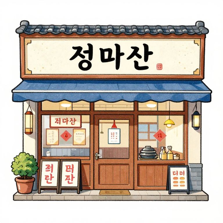 Colorful digital drawing of a traditional Japanese restaurant with a blue roof, wooden door, and Korean signage, featuring potted plant and menu boards.