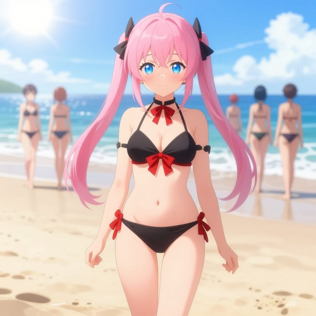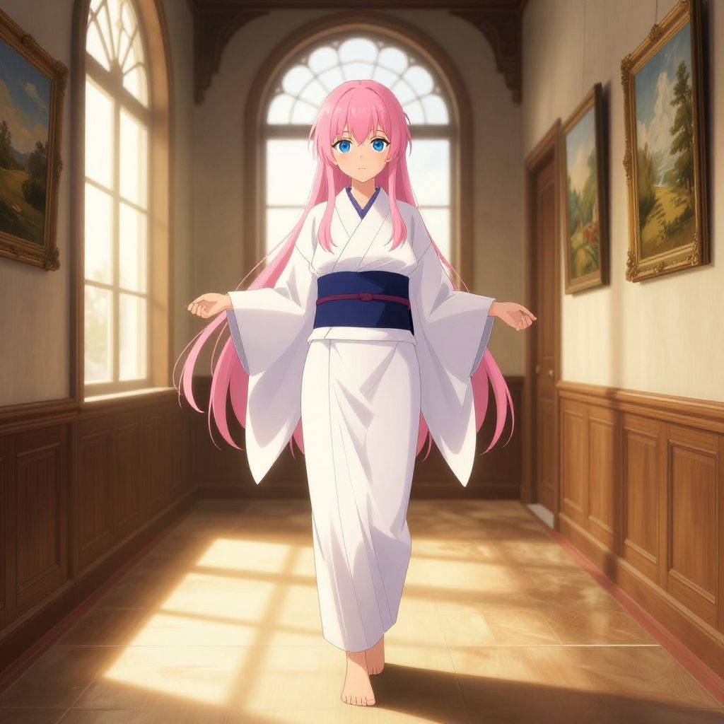 Digital anime-style artwork of a young woman with long pink hair and blue eyes standing barefoot in a castle hallway. She wears a white kimono with a dark blue obi sash, holding the kimono sleeves out. The ornate arched windows behind her let in warm golden hour light, casting intricate shadows on the floor. The interior features wood paneling, framed landscape paintings, and a soft impressionist glow.