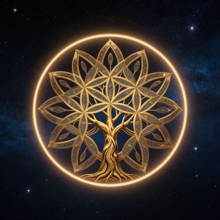 The image presents a surreal and intricate scene reminiscent of the \"Tree of Life\" from \"2001: A Space Odyssey\" and the \"Flower of Life\" from sacred geometry. At the center, a golden, intricately patterned tree with a flower-like structure stands tall, its branches extending outward in a symmetrical, geometric pattern. The tree is encircled by a glowing, ethereal ring, suggesting a sense of sacredness or divine presence. The background is a deep, starry expanse, with a gradient of dark blues and blacks, punctuated by distant stars and nebulae, creating a cosmic atmosphere. The overall composition is balanced, with the tree and its surrounding ring positioned centrally, drawing the viewer's eye to the heart of the image. The interplay of light and shadow, along with the detailed textures of the tree and the glowing ring, adds depth and dimension to the scene, evoking a sense of wonder and mystery.