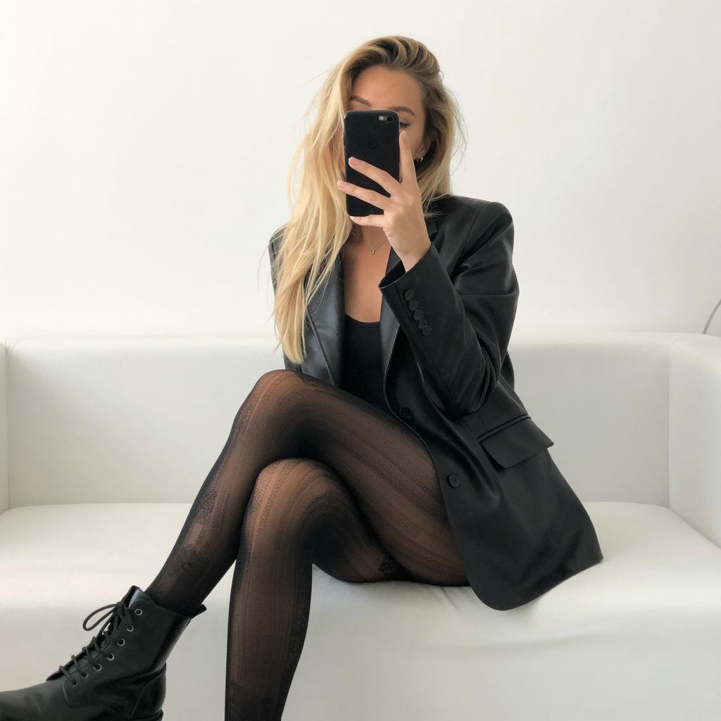 Blonde woman wearing a black leather blazer, black patterned tights, and black combat boots sitting on a white couch. She is holding a black smartphone in front of her face, capturing a mirror selfie against a plain white wall background.