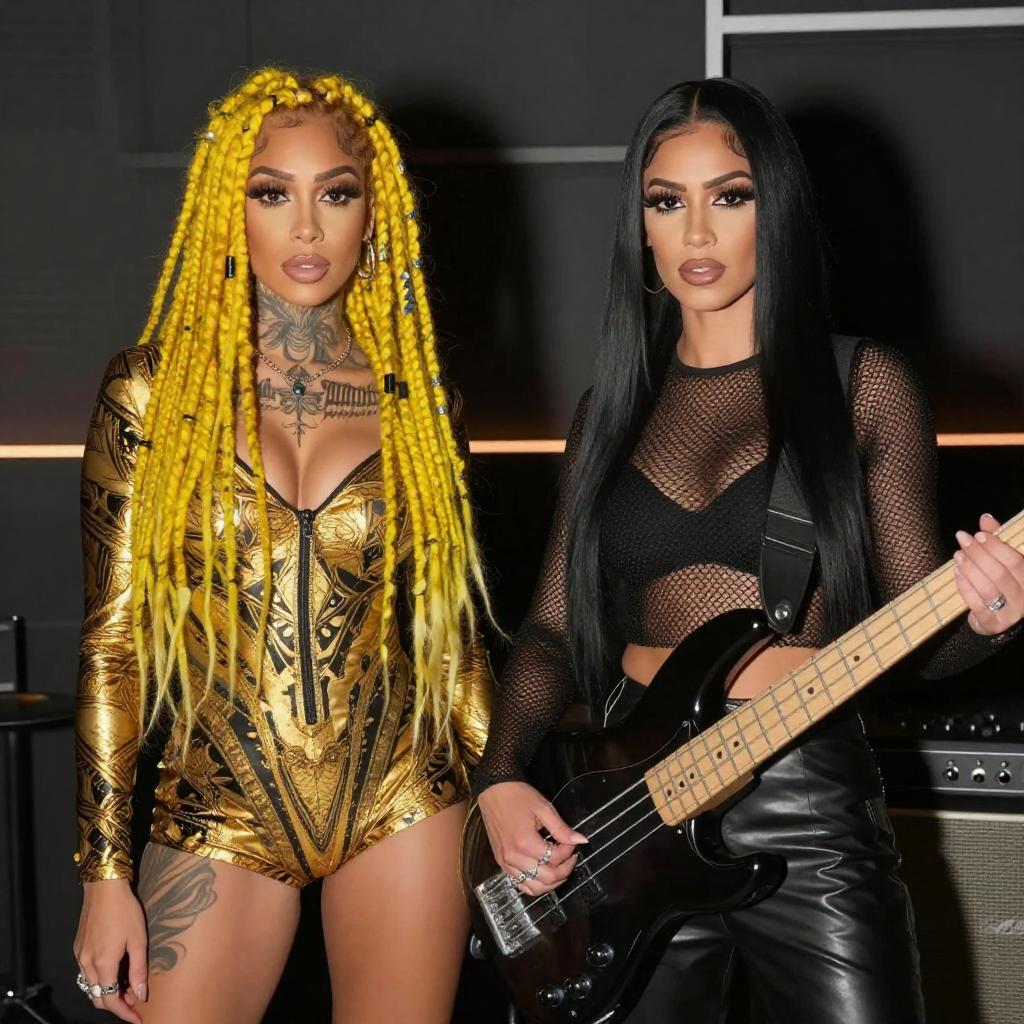 Two Women with Distinct Fashion and Electric Bass Guitar