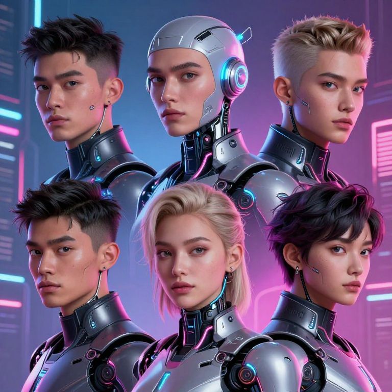 This is a highly detailed, CGI-rendered image featuring six futuristic, cybernetic individuals with human and robotic features. They have varied hairstyles, from short and spiked to blonde and black, and wear sleek, metallic, high-collared armor with glowing blue and pink neon accents. Each person has cybernetic enhancements, including visible earpieces and glowing circuits on their necks. The background is a neon-lit, futuristic cityscape with vertical lines of pink and blue lights. The individuals' expressions are serious and focused, adding a sense of intensity to the scene. The overall style is modern sci-fi with a high-tech, cyberpunk aesthetic.