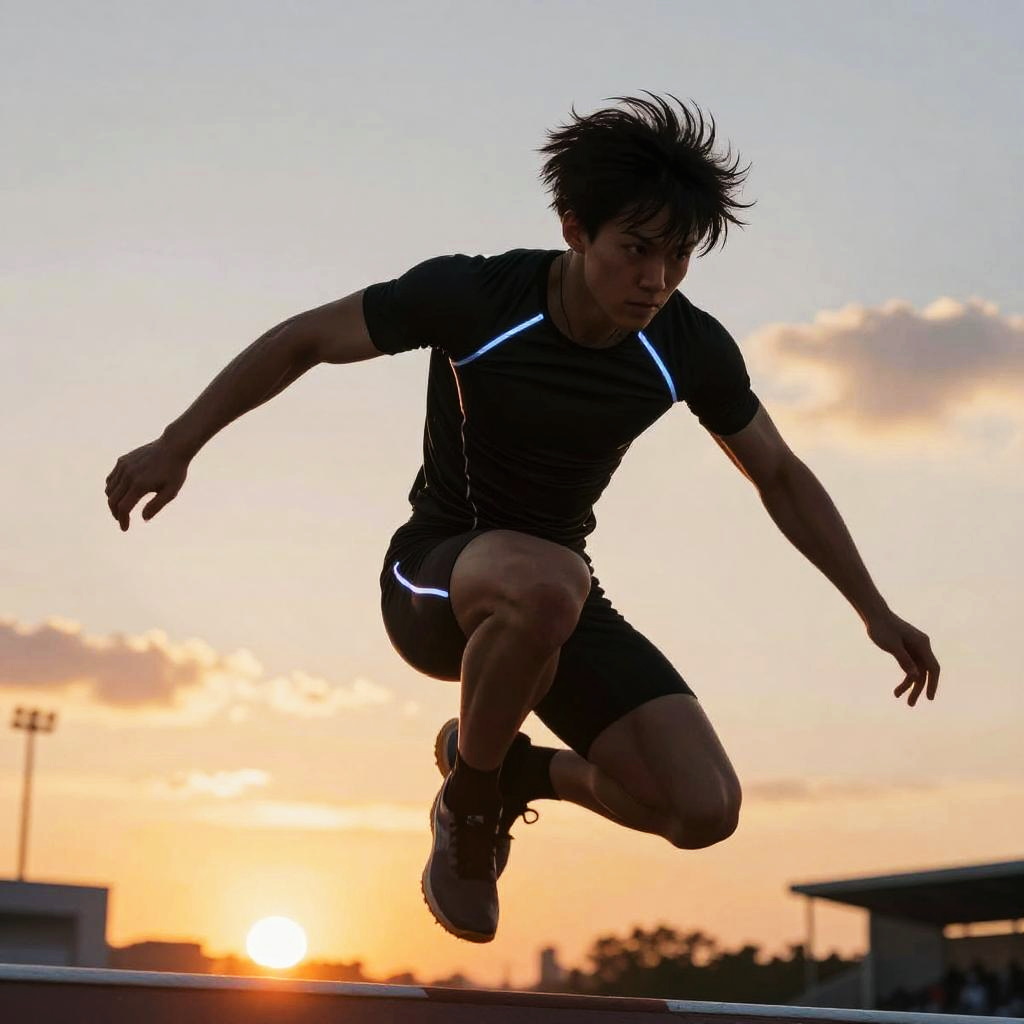 Skimpy speedos worn by a male athlete sprinting on a stadium track, muscular physique, sunset lighting, detailed textures, energetic and powerful atmosphere