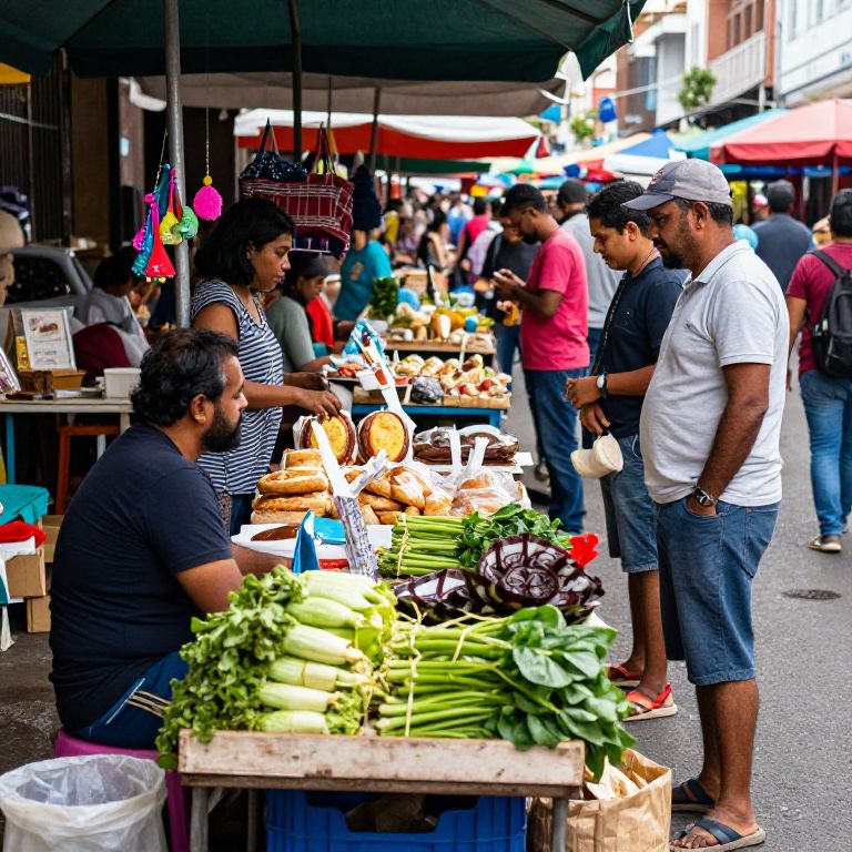 A vibrant market street filled with everyday life street vendors, their tables covered in fresh vegetables, baked goods, and handmade crafts, surrounded by curious shoppers and the sounds of bustling city life.