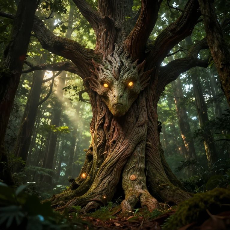 Digital fantasy artwork of a menacing, glowing-eyed, twisted tree with gnarled bark in a dense, sunlit forest. Light filters through leaves,