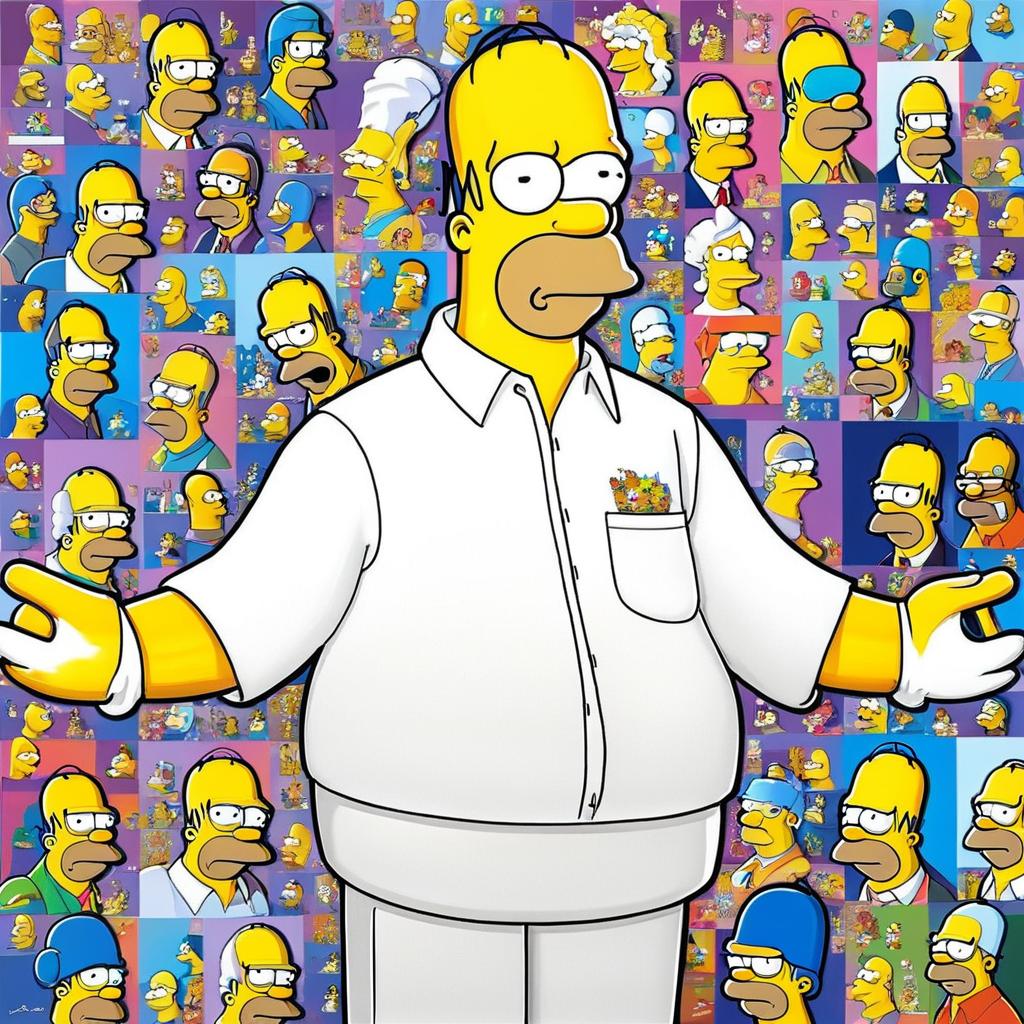 Digital artwork featuring Homer Simpson, the famous character from The Simpsons, in a white shirt with outstretched arms. The background is a vibrant collage of various smaller images of Homer Simpson in different poses and outfits, displaying his iconic yellow skin and cartoon style.