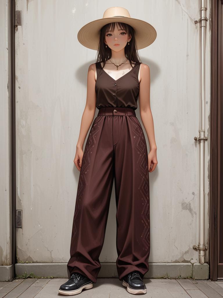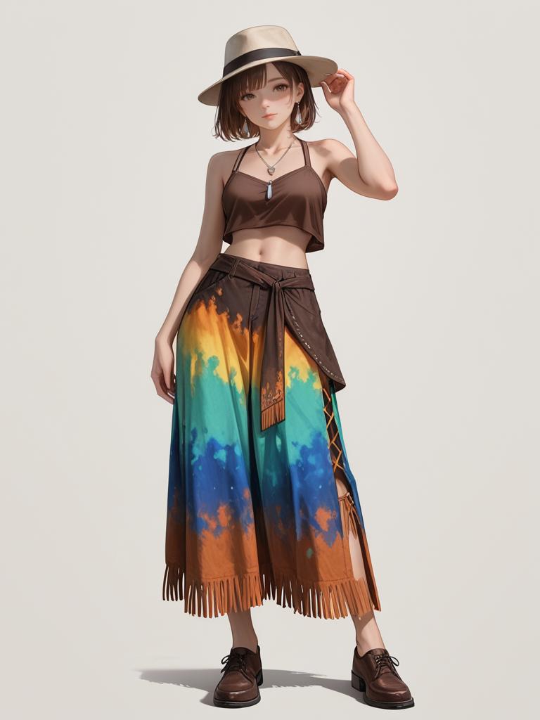 1girl, realistic face, full body shot, Woman, bohemian style, translucent brown tank top with tie-dye effect, halter neckline, waist adorned with fringe details, short length revealing midriff, layered fringes with varying lengths, casual fedora hat, silver pendant necklace, white background.
