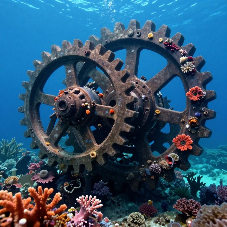 Gigantic mechanical gears, encrusted with vibrant coral and marine life, silently rotate deep beneath the ocean's surface, merging industrial precision with the organic beauty of the abyss.