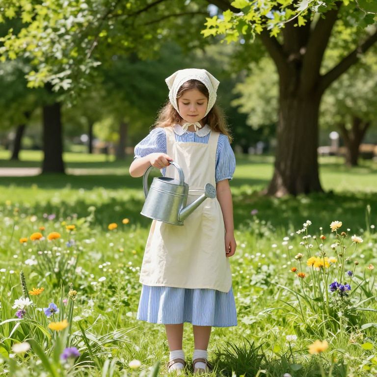 Photograph of a young girl with light brown, wavy hair wearing a white headscarf, blue and white striped dress, and white apron. She stands in a sunlit, green grassy field with colorful wildflowers, pouring water from a silver watering can. The background features tall trees with lush green leaves and a blurred park setting. The girl's expression is focused, and she is wearing white socks and brown shoes. The bright sunlight creates a warm and serene atmosphere.
