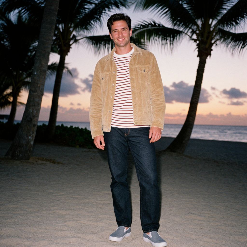 A man, tan corduroy jacket, striped long-sleeve shirt, dark wash slim jeans, gray canvas slip-ons, tropical beach oasis, swaying palm trees, vibrant sunset hues, 3M analog film stock, relaxed smile, carefree vibe. Man has masculine face and piercing eyes