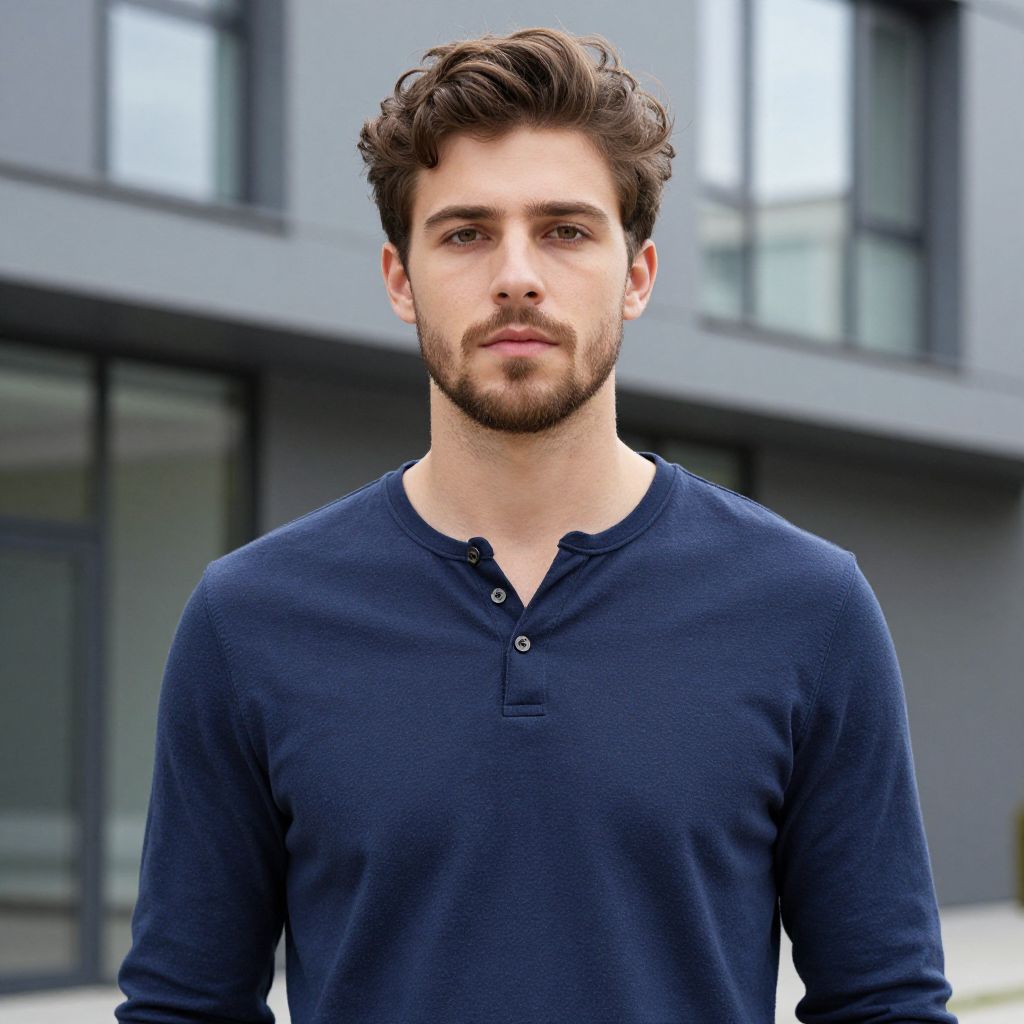 Photograph of a handsome young man with light skin, brown wavy hair, and a trimmed beard. He's wearing a navy blue, long-sleeve, henley shirt with the collar buttoned. He stands in front of a modern, gray building with large windows, looking directly at the camera with a neutral expression. The lighting is bright and natural.