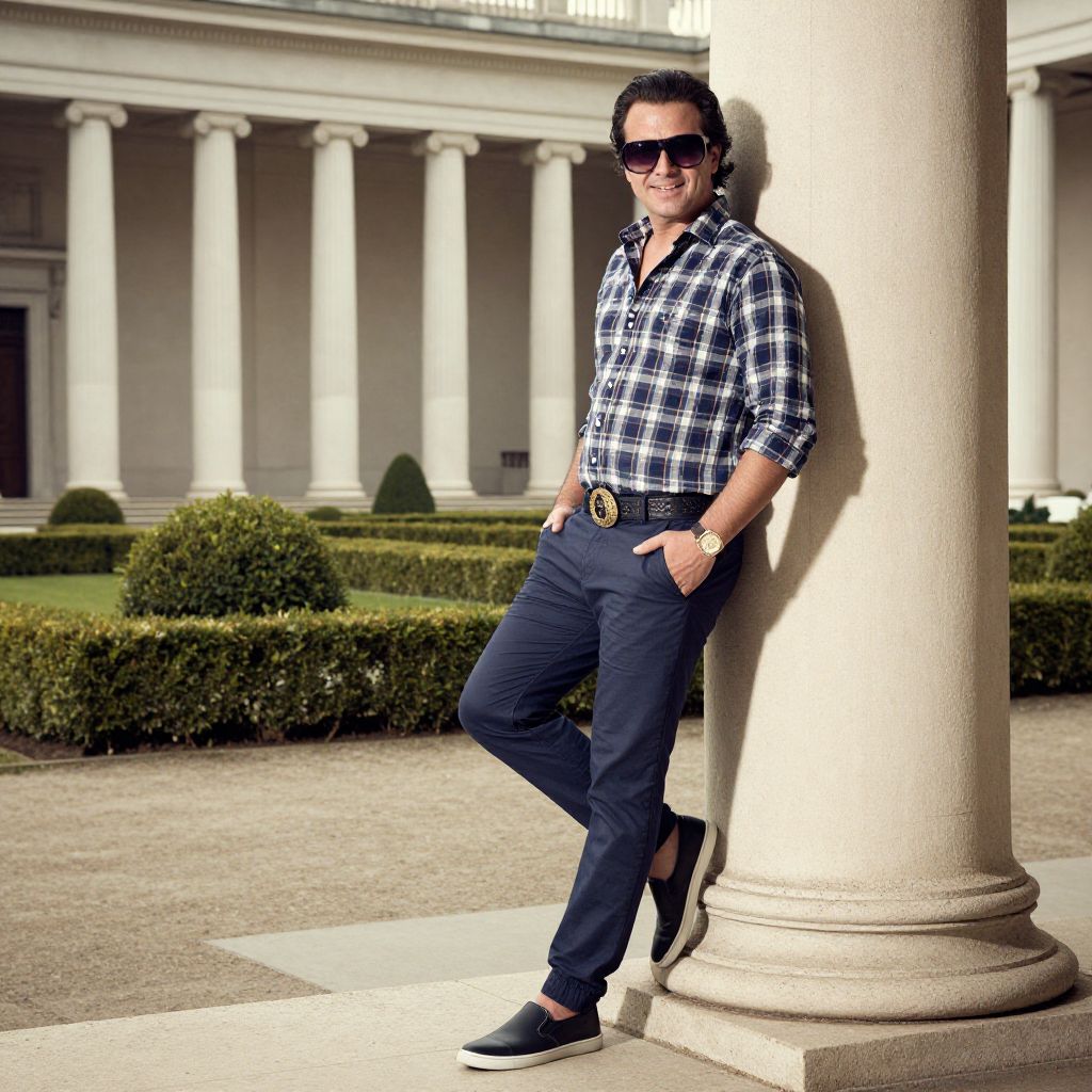 Photograph of a middle-aged man with olive skin and dark hair, wearing black sunglasses, a blue and white plaid shirt, dark blue pants, and black loafers. He leans casually against a white stone pillar, hands in pockets, with a gold belt buckle visible. The background features a neoclassical building with white columns, green trimmed hedges, and a gravel courtyard. The image has a slight vintage filter, giving it a nostalgic feel. The man's relaxed posture and stylish outfit convey a laid-back, confident demeanor.