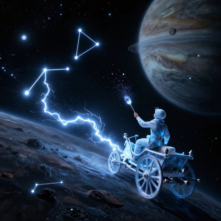 An astronomer rides a chariot of frozen lightning across the surface of a gas giant, mapping constellations with a brush dipped in stardust and silence.