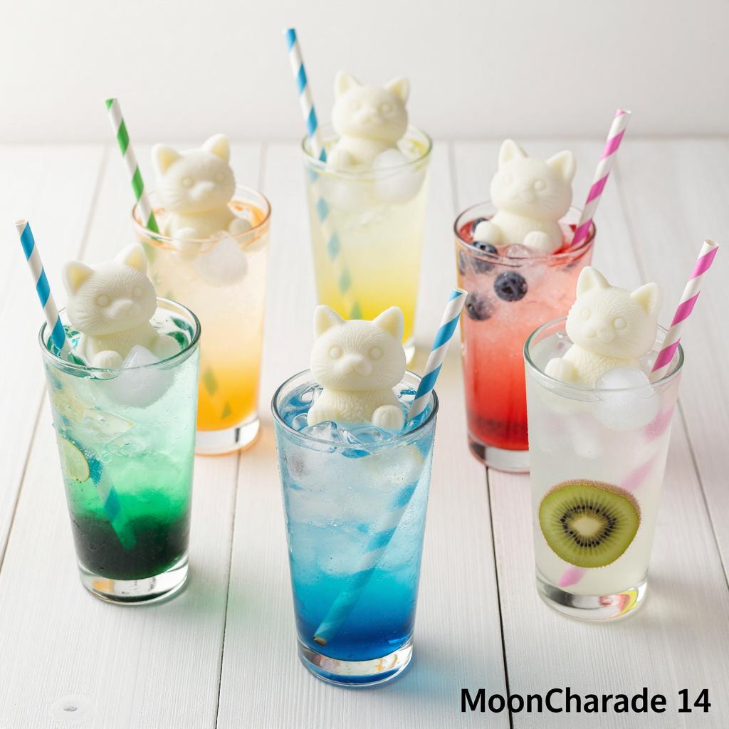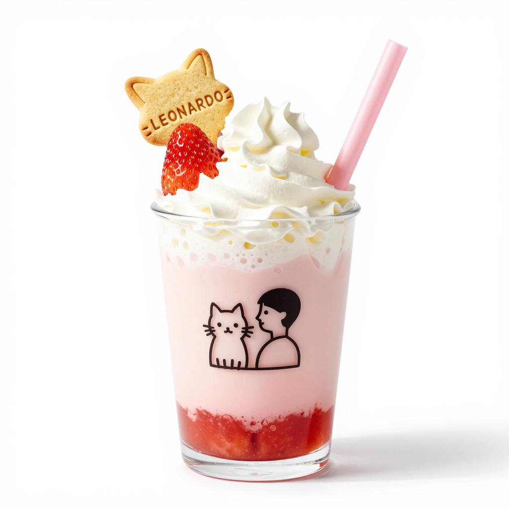 Glass dessert cup with gradient pink to white liquid, topped with whipped cream, strawberry, yellow cat-shaped cookie with "LEONARDO," and pink straw. Black line drawing of a cat and person on cup. Clear background.