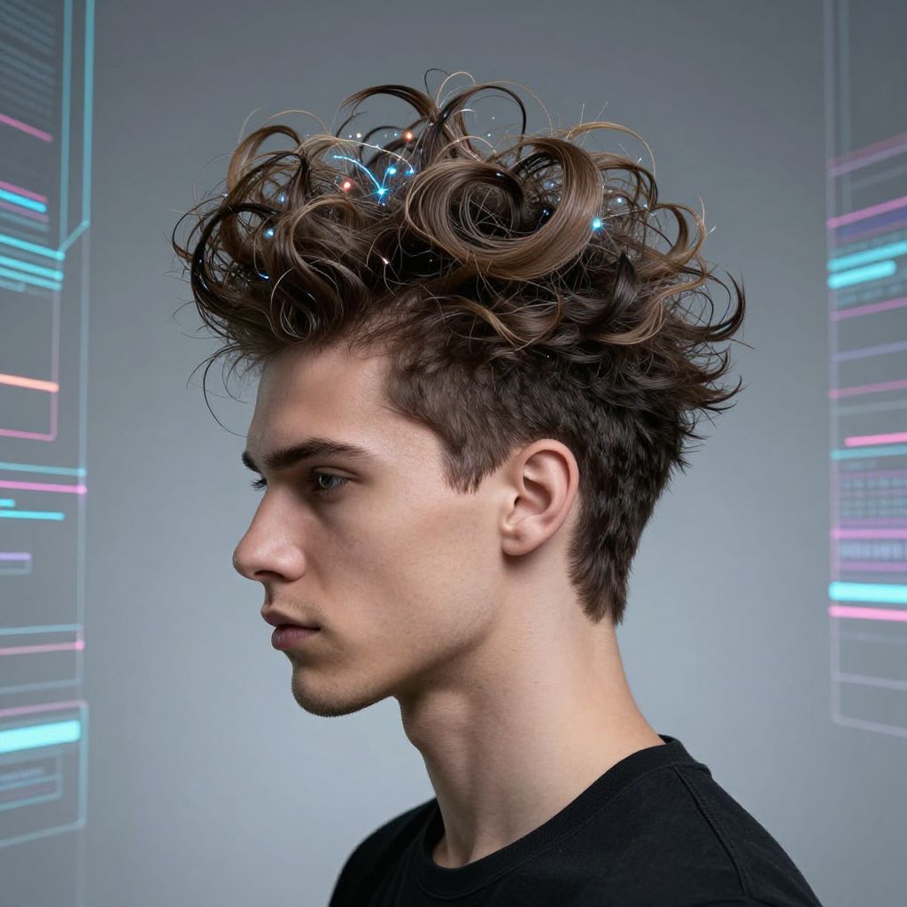 Hairstyle AI men experimental fashion shoot, men with avant-garde AI-designed hairstyles combining digital effects and organic flow, surreal textures with glowing accents, abstract background of floating data streams and circuitry, high contrast, photorealistic render