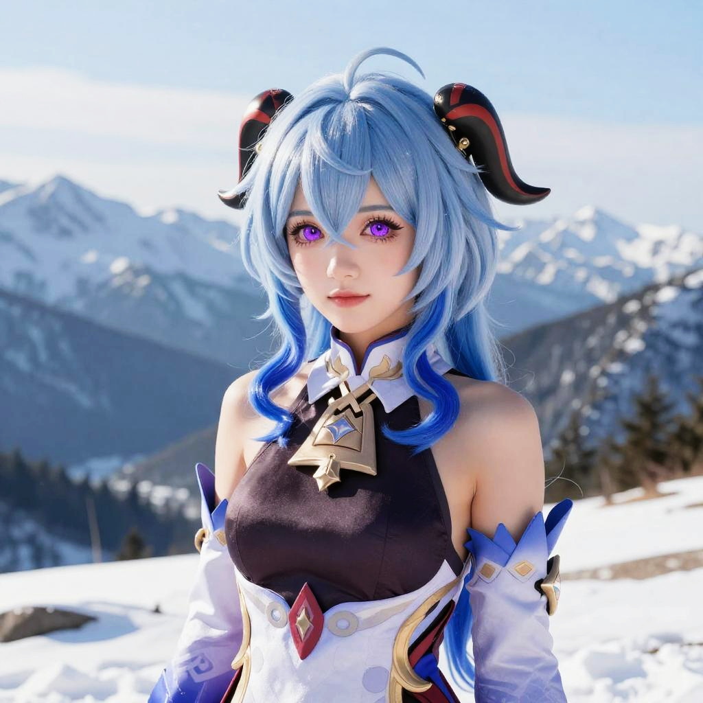 Ganyu \(genshin impact\), ganyudef, outdoors, snowy mountains, mountains, purple eyes, volumetric lighting, soft lighting, cinematic, looking at viewer