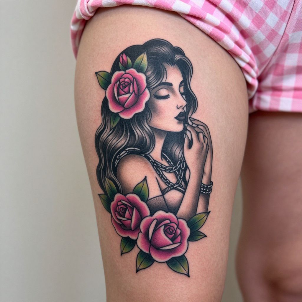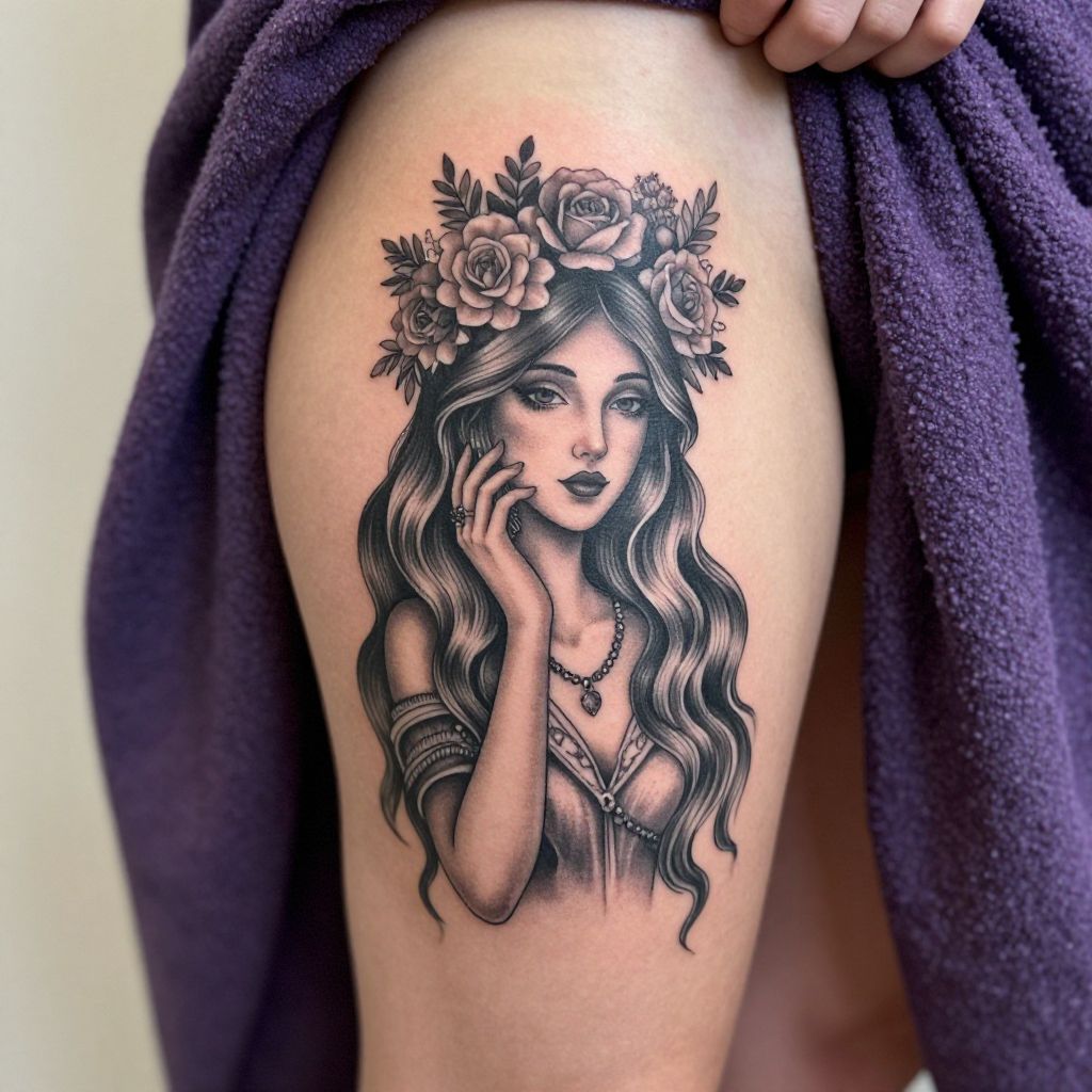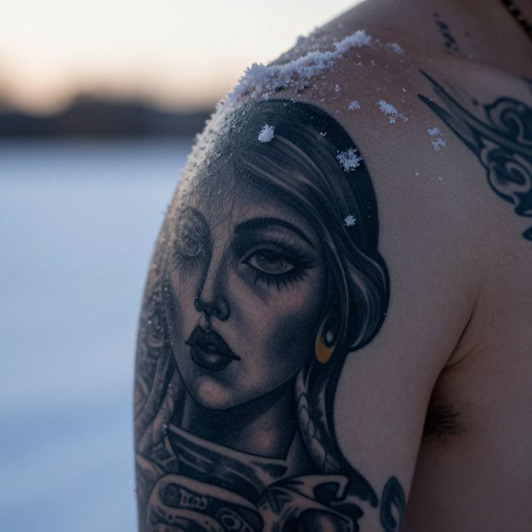 Photograph of a tattooed, light-skinned shoulder with a detailed, black-and-gray portrait of a woman with a somber expression. The woman has long hair, wears a headscarf, and has large, dark eyes with heavy eyeliner, a nose ring, and gold hoop earrings. Snowflakes rest on her shoulder, contrasting with the dark ink. The background is blurred, with a soft, out-of-focus blue and white gradient, suggesting an outdoor, wintry setting. The tattoo is highly realistic, showcasing fine lines and shading. The image focuses closely on the tattoo, highlighting its intricate details and textures.