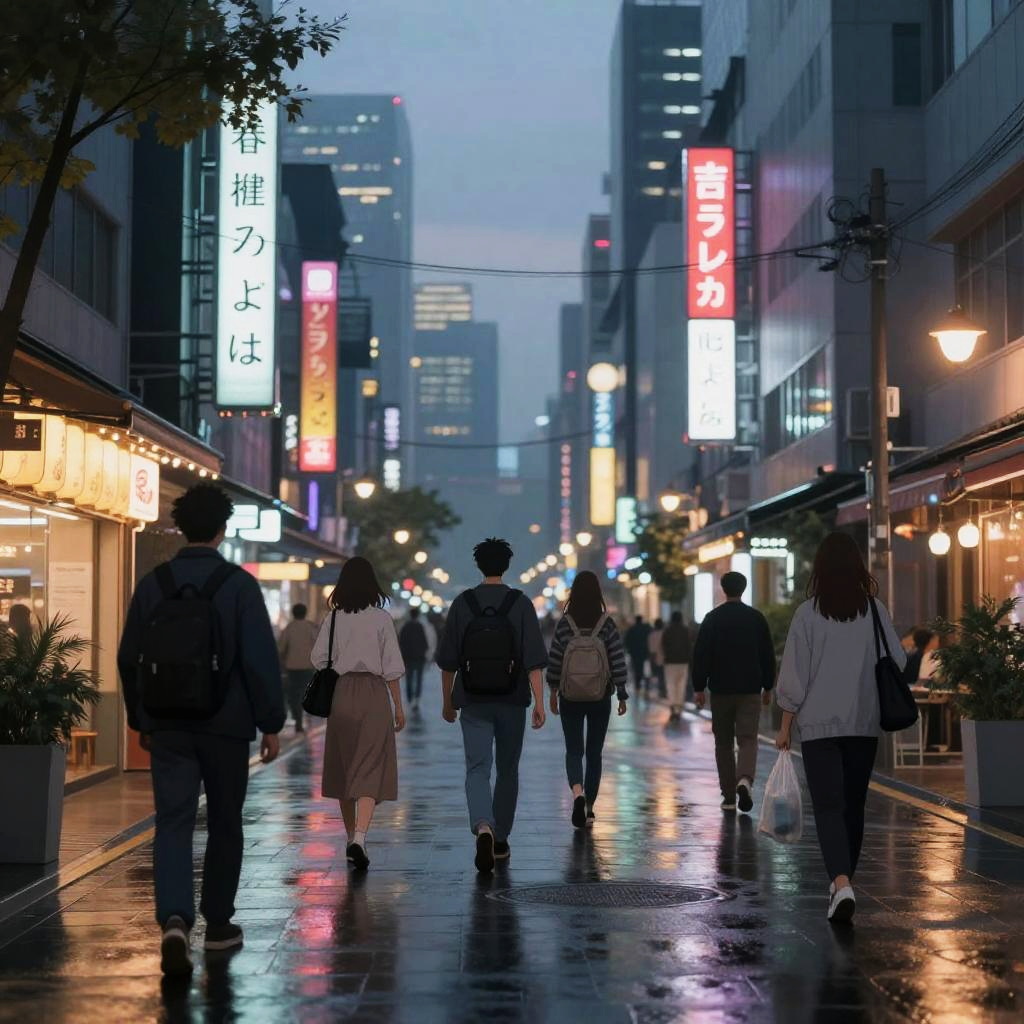 Anime realista cityscape at dusk, neon lights reflecting on wet streets, detailed characters blending into realistic urban environment, vibrant colors, high detail