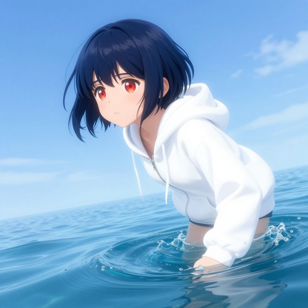 Digital art: Asian girl with short black hair, wearing red and white hoodie, standing in clear blue lake, sunlight reflecting on water.