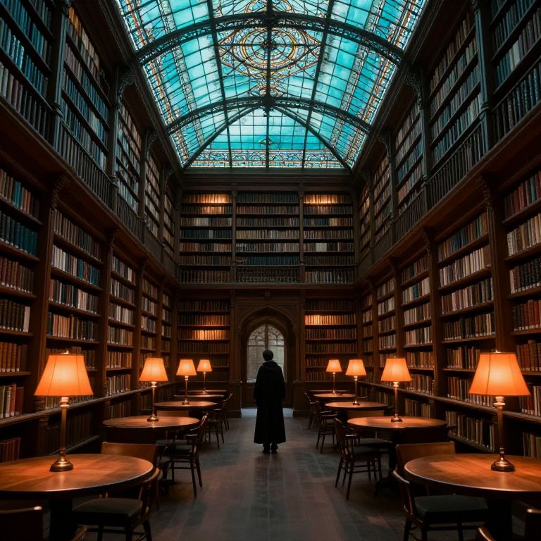 Majestic library bathed in ethereal teal light cascading through an ornate stained-glass ceiling, flanked by towering wooden bookshelves filled with countless volumes, illuminated by warm orange lamps casting soft shadows over rows of round tables and chairs, while a solitary figure in dark robes stands contemplatively near the center aisle, creating an atmosphere of timeless mystery and scholarly serenity.