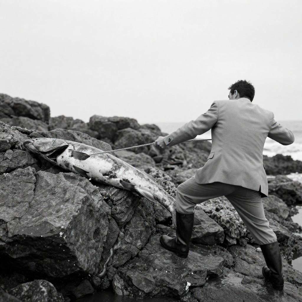 Black-and-white photograph of a man in a light-colored suit and boots, pulling a large, decaying fish from rocky terrain near the ocean. Man's back is to the camera, arms extended. Fish hangs horizontally, partially submerged in rocks. Rocky, ured background. Man's stance is dynamic, fish limp. Sky visible in background.