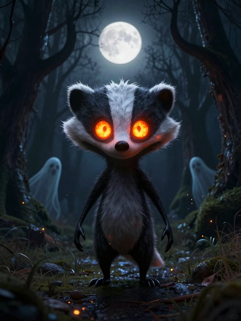 Digital CGI artwork depicts a cute, anthropomorphic badger with glowing, fiery orange eyes standing in a dark, eerie forest under a full moon. The badger's fur is black and white, with a fluffy white face and chest. Two ghostly figures with white, translucent bodies lurk in the misty background. The forest is dense with twisted, leafless trees and patches of moss-covered ground. The moonlight casts a blue hue over the scene, enhancing the spooky yet whimsical atmosphere. The badger's intense eyes and the ghostly figures create a sense of mystery and intrigue.