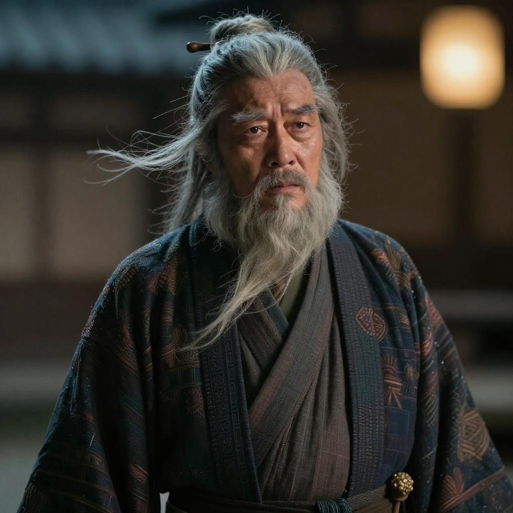 Cinematic film still, old man, sad, long beard, masterpiece, best quality, dynamic pos, ultra detailed, (samurai_clothing), shallow depth of field, vignette, highly detailed, high budget, bokeh, cinemascope, moody, epic, gorgeous, film grain, grainy