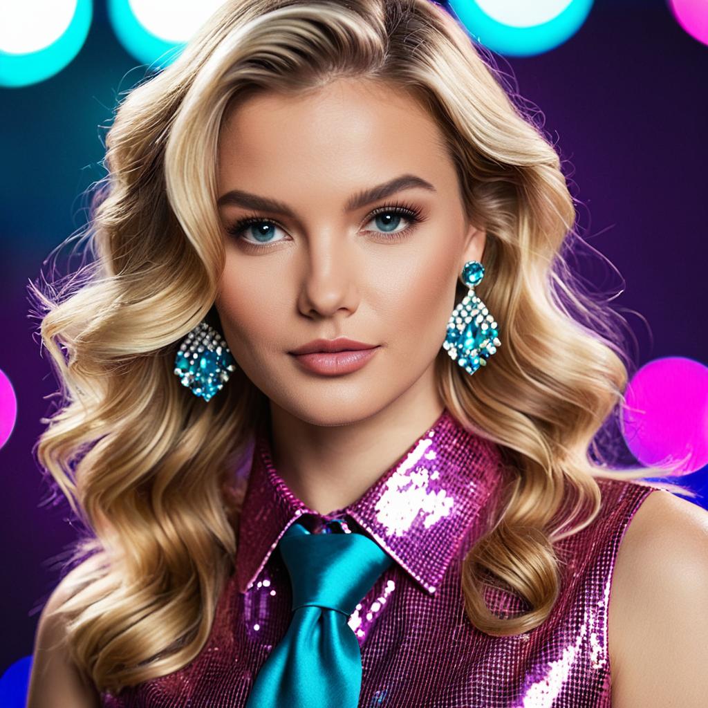 Disco party outfit, photorealistic portrait, young woman with wavy blonde hair, wearing shiny pink metallic top with blue tie, large sparkling teal earrings, soft purple and pink bokeh background, direct gaze, elegant and confident expression, studio lighting, fashion photography style, close-up, glamorous, high detail, digitally rendered, realistic ures and lighting, fashionable, model with fair skin, subtle makeup, stylish and modern look