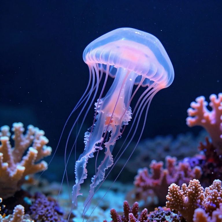 Digital artwork depicting a luminous translucent jellyfish gliding underwater among vibrant and colorful coral formations. The scene highlights the jellyfish's delicate tentacles and bell, with a deep blue background emphasizing the glowing hues and intricate marine details.