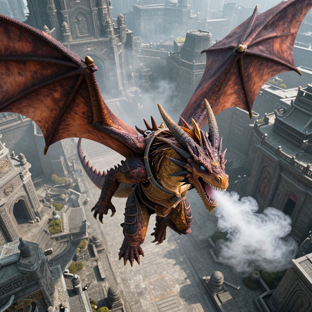 A highly detailed, digital CGI image depicts a large, red dragon with spiked scales and enormous, membranous wings soaring over a medieval cityscape. The dragon, with a fierce expression and sharp teeth, breathes a plume of white smoke. Its wings are outstretched, showing intricate, vein-like patterns. Below, the city features towering, stone Gothic buildings with arched windows and ornate details. The sunlight casts shadows, adding depth to the scene. The overall atmosphere is one of epic fantasy, with the dragon dominating the sky above the historic architecture.