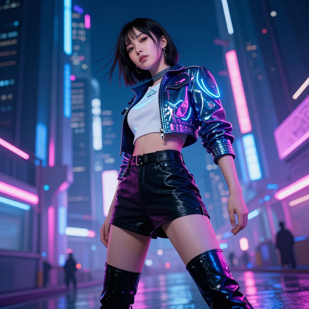 Digital art of a young Asian woman in a neon-lit futuristic scene, wearing a crop top and frayed denim shorts, with glowing "AICT