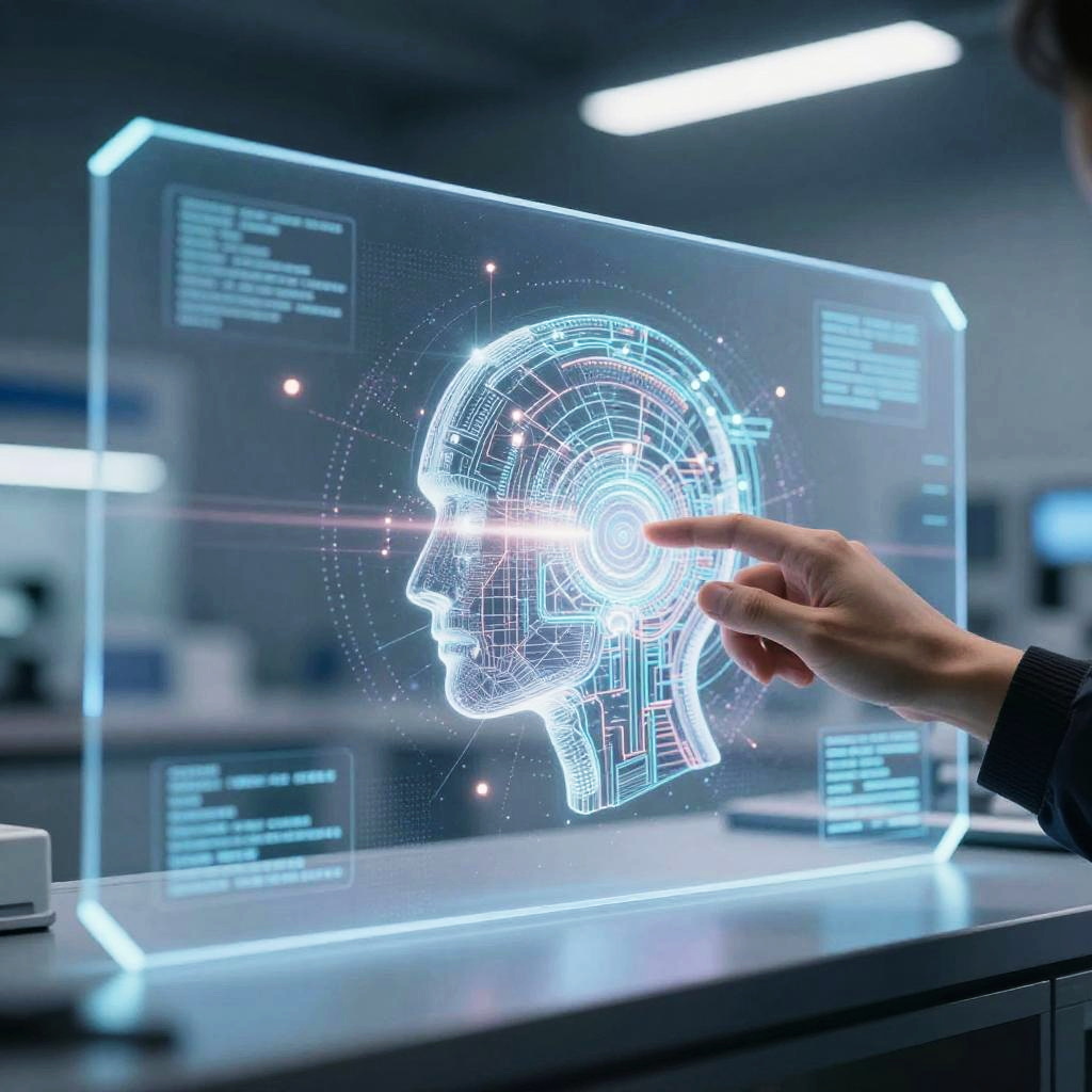Make ai image of an advanced artificial intelligence system creating intricate digital artwork on a translucent screen, with beams of light and geometric patterns floating around, in a high-tech laboratory environment, ultra-realistic