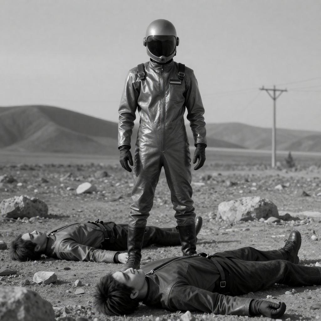 Black-and-white photograph of a humanoid figure in a shiny, full-body suit with a helmet, standing over a rocky, desolate landscape. The figure's face is obscured. Several lifeless bodies lie on the ground in front of it. Background includes hills and power lines. The scene conveys a sense of desolation and eeriness.