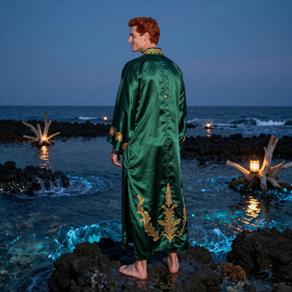 Masterpiece, best quality, (photorealistic:1.4), full body, ultra-detailed photo of a tall red-haired man with sharp cheekbones, wearing a flowing emerald-green silk robe with golden embroidery, standing in a bioluminescent tidepool on a remote coral atoll at dusk, phosphorescent waves lapping black volcanic rocks, scattered driftwood lanterns casting soft amber pools of light and a star-spangled sky, smiling with an hourglass silhouette, viewed completely from behind