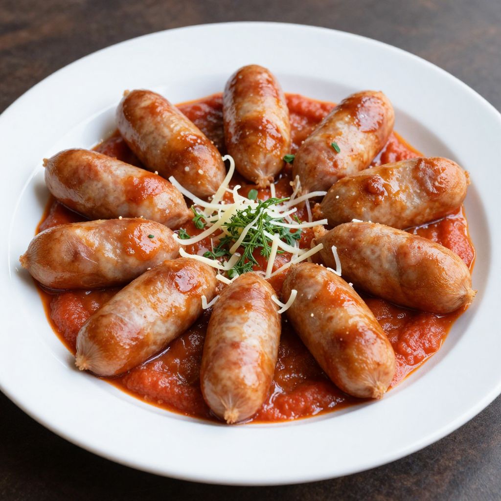 Golden Portuguese linguica sausages, fully cooked and arranged in a circular pattern, are nestled in a rich, glossy tomato sauce garnished with fresh herbs and grated cheese, presented elegantly on a white plate.