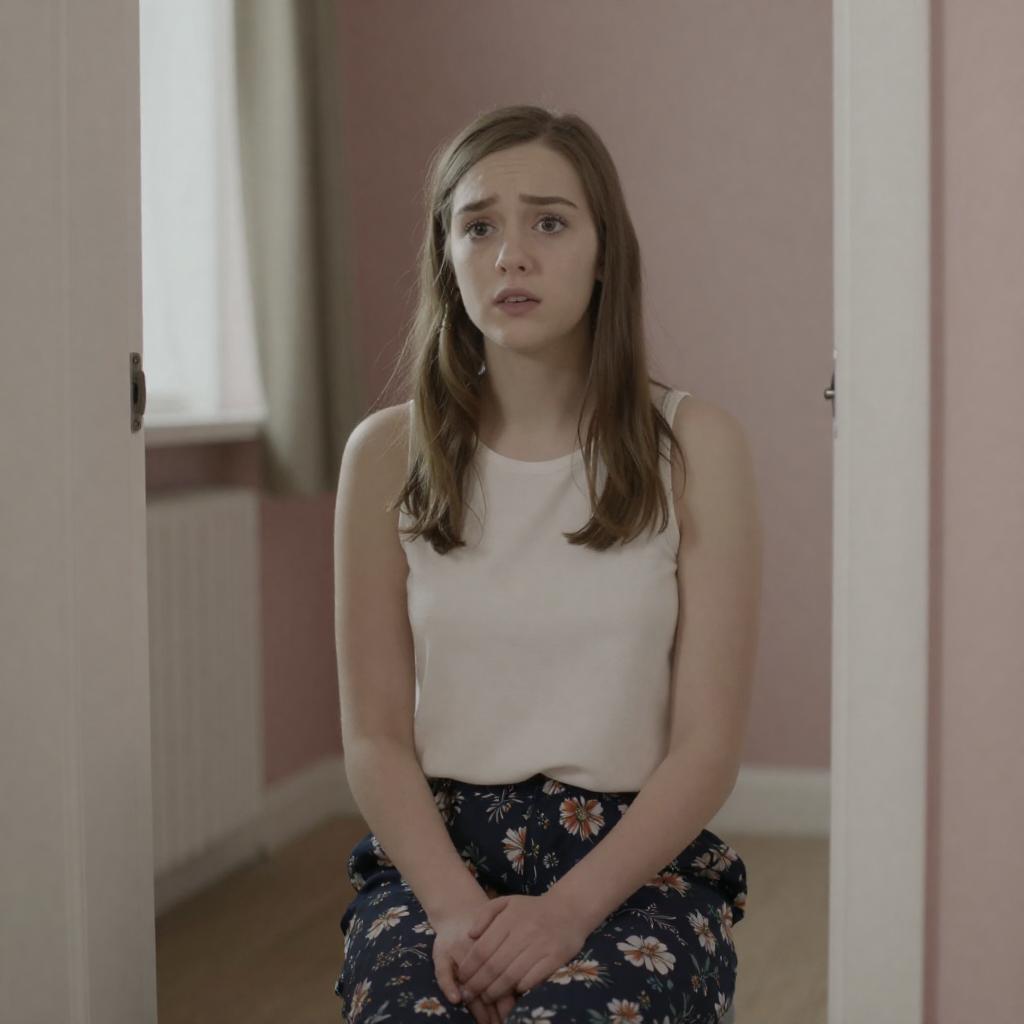 Young woman with light skin and brown hair, wearing a white sleeveless top and dark blue floral pants, sitting in a doorway. She has a concerned expression, hands clasped in front. Background includes a radiator, curtain, and pink wall. Soft natural light.