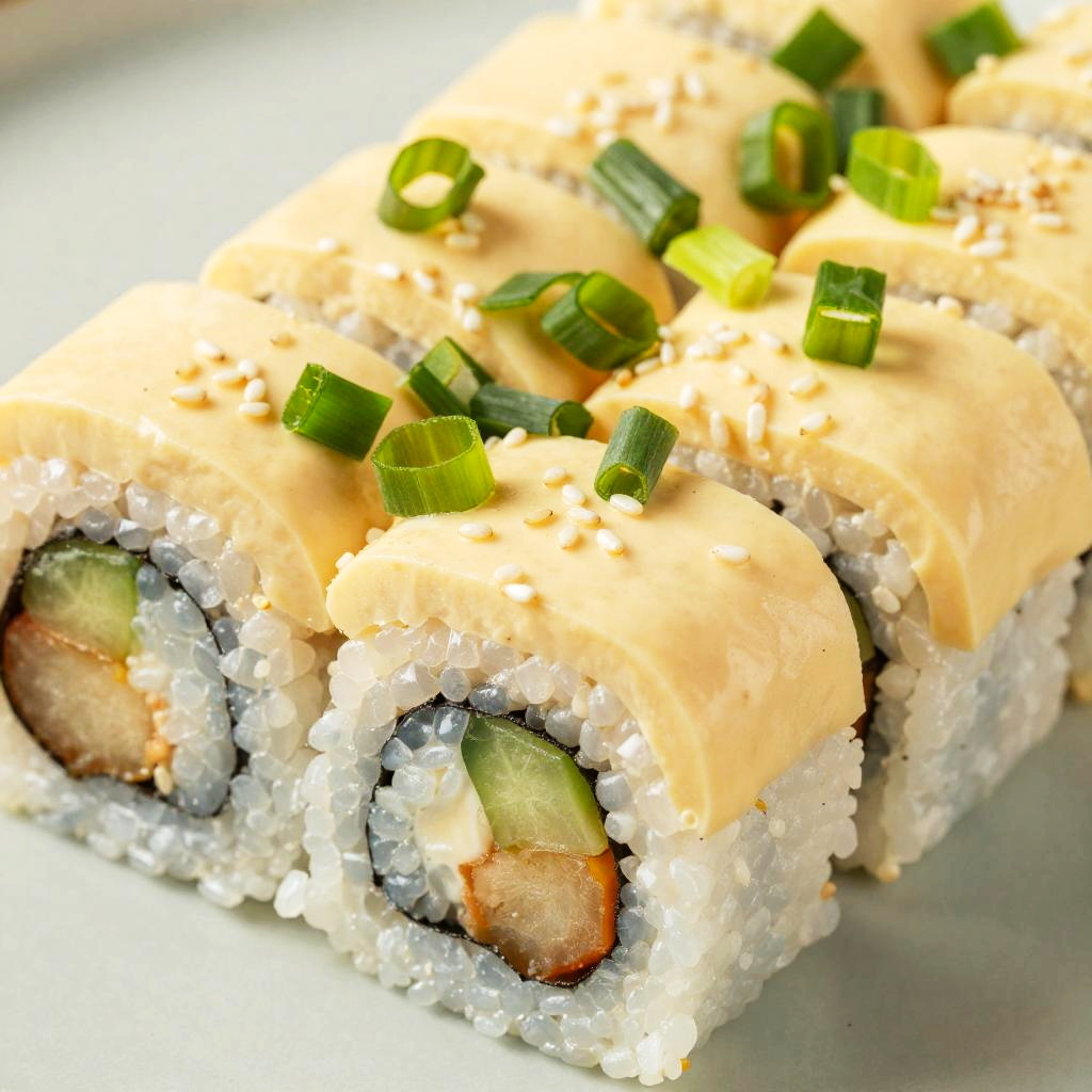Close-up photo of a colorful sushi roll with thick cucumber slices forming a spiral pattern around chunks of creamy, orange-tinted tofu. The tofu is sprinkled with white sesame seeds and finely chopped green onions. Thin green onion slices are also placed on top, adding a fresh touch. The image has a vibrant, appetizing look with a gray background.
