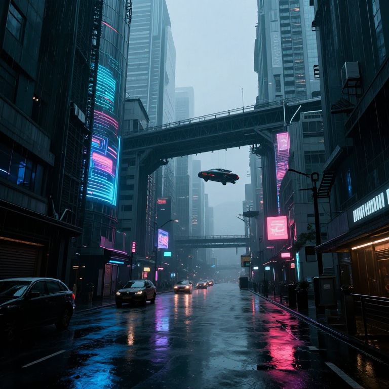 Dark futuristic city with rain-drenched streets and reflective puddles, neon drenched alleys filled with augmented reality projections, sleek flying cars hovering above, colossal bridges connecting ultra-modern high-rise buildings, a blend of technology and gritty urban decay
