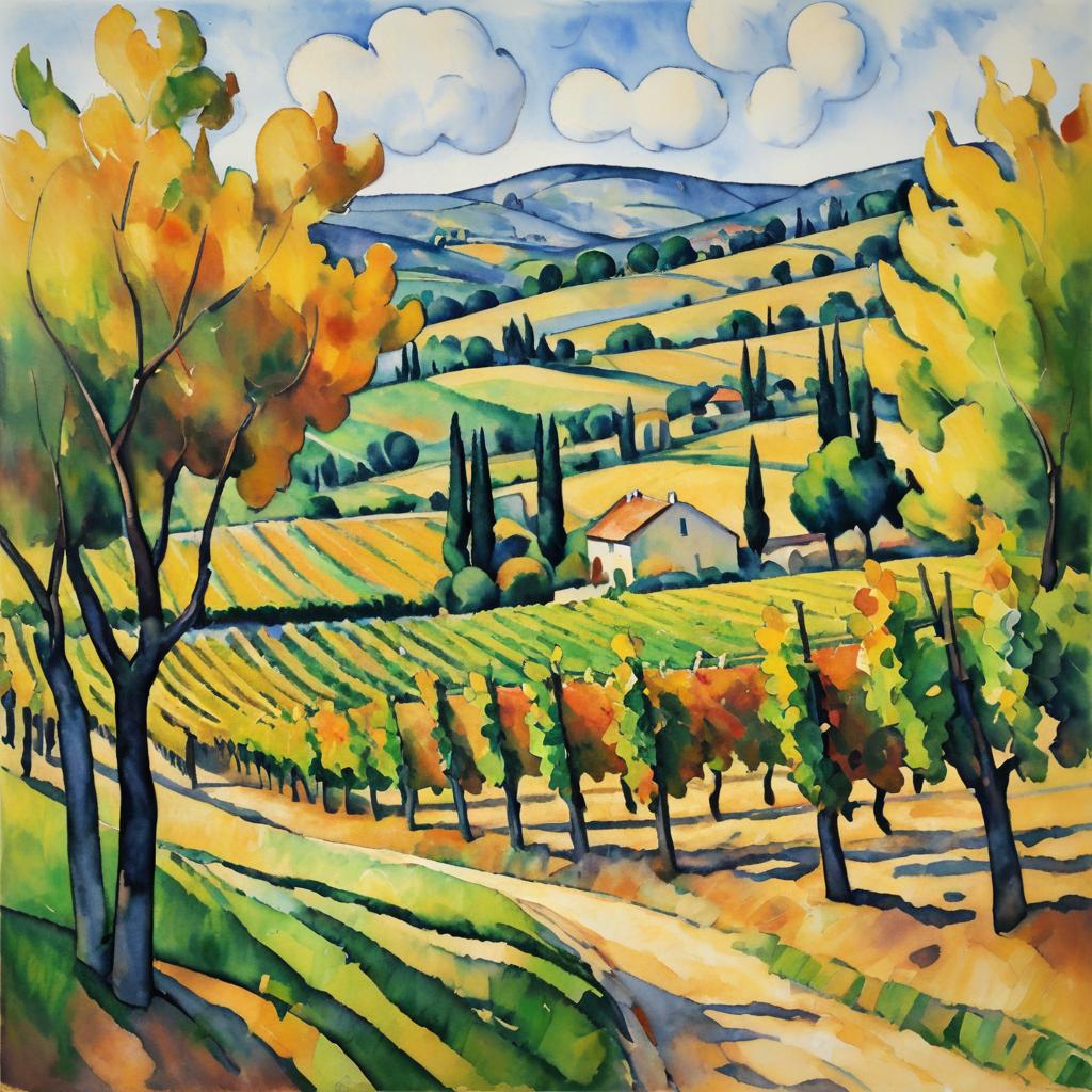 A detailed illustration of a picturesque vineyard during autumn, featuring rolling hills, vibrant yellow and green fields, and rows of grapevines. The scene includes a traditional farmhouse surrounded by tall cypress trees, evoking the style of Paul Cézanne. The artwork showcases a serene rural landscape with a focus on natural beauty and seasonal colors.