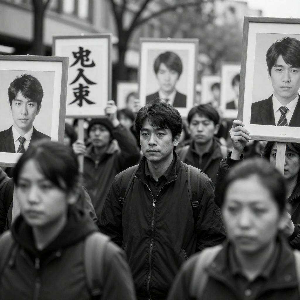 Black-and-white photograph of a crowded protest. People hold framed portraits with Japanese characters. A man in the center wears a dark jacket, stands slightly forward. Crowded background, intense expressions on faces. Several people in the foreground. Urban street setting.