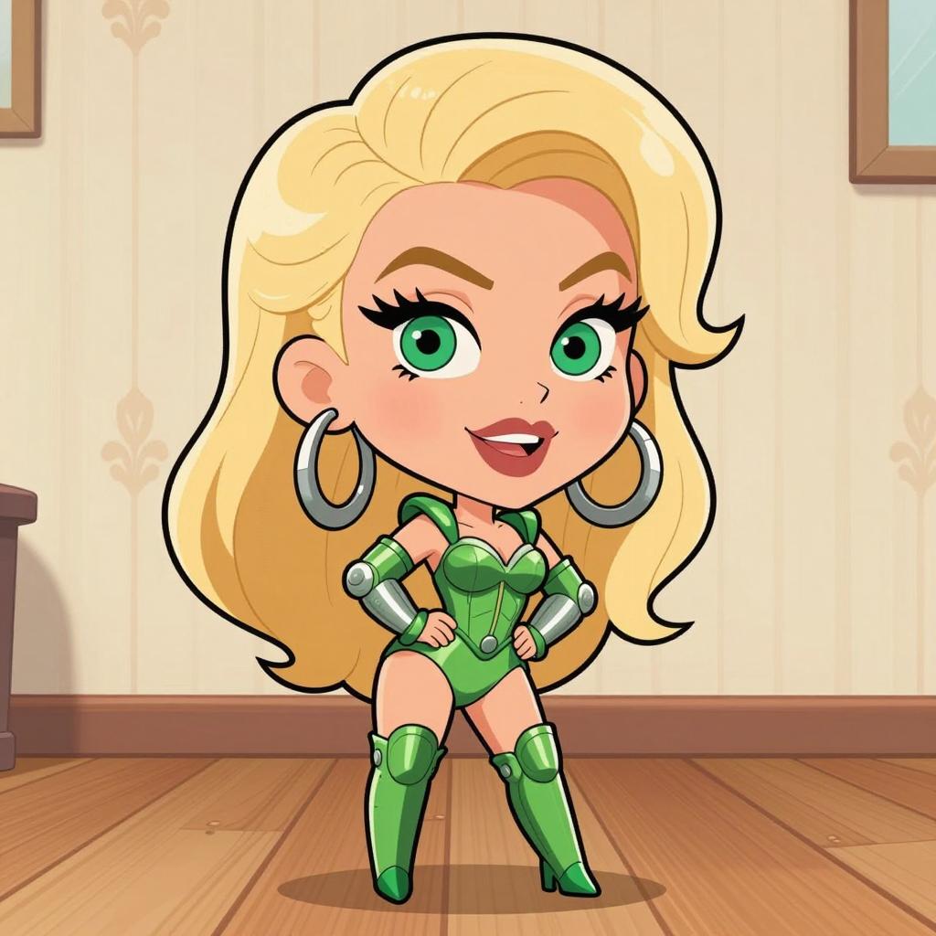A cartoon caricature of a confident woman dressed in a classic pin-up style bunny costume, standing indoors under a warm hanging lamp. She has long red hair and is wearing a shiny black corset with fishnet stockings, black bunny ears, and a soft, warm background with wooden accents. The scene emphasizes bold outlines and flat color shading with an overall warm orange and black color palette.
