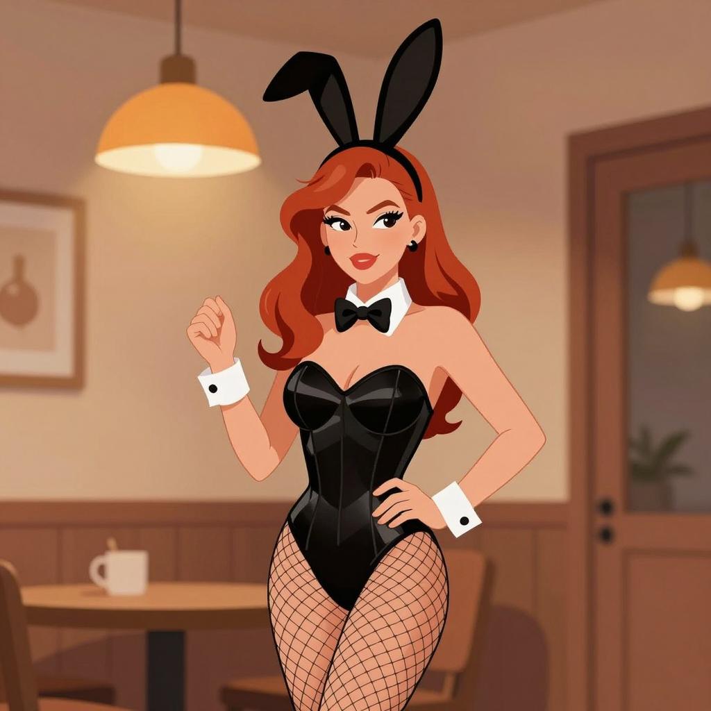 A cartoon caricature of a confident woman with long red hair dressed in a classic pin-up style black bunny costume. She wears a shiny black corset, black fishnet stockings, black bunny ears, white cuffs, and a black bow tie. The indoor setting has warm lighting with wooden accents and a soft orange color palette.