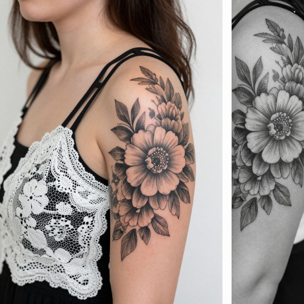 Photograph of a woman with fair skin and brown hair, shown from the shoulders up, wearing a black and white lace-trimmed top. She has a detailed black and gray floral tattoo on her upper left arm, featuring large flowers and leaves. The background is blurred and white. On the right, there's a smaller black-and-white close-up of the tattoo.