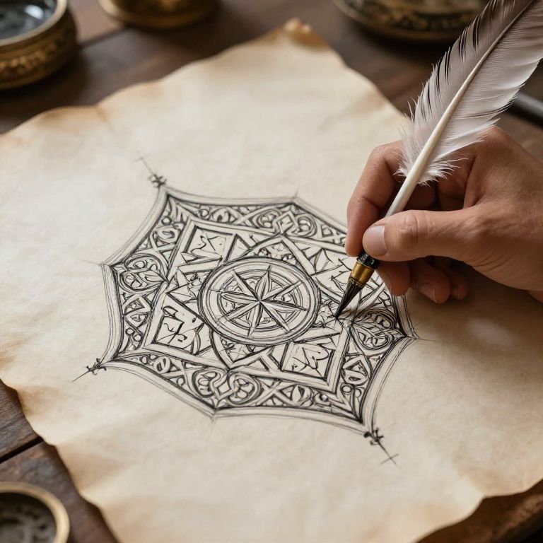 Arabic style prompt of an artist sketching intricate Islamic geometric designs on parchment, soft natural light, ink and feather quill tools, historical ambiance, detailed brushwork, subtle shadows, midjourney aesthetic.