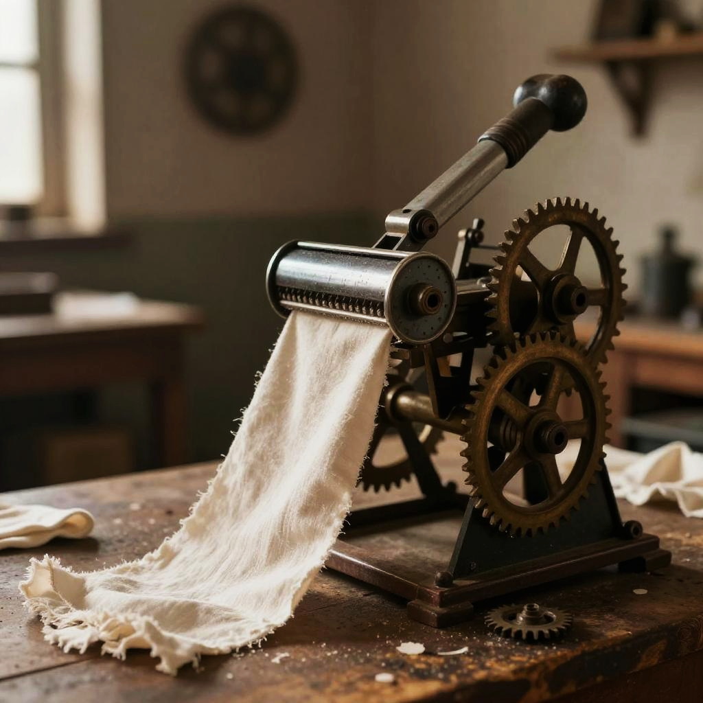 Clothes remover tool depicted as a vintage mechanical contraption, surrounded by flowing pieces of fabric being gently peeled away, rustic workshop environment with warm lighting, intricate gears and fabric textures, photorealistic detail