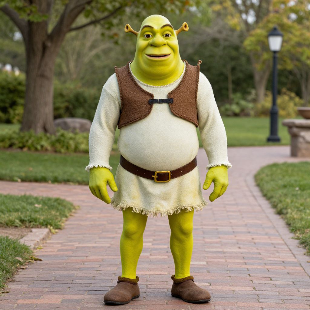 Shrek Movie Costume, dressed in a costume standing on a brick walkway