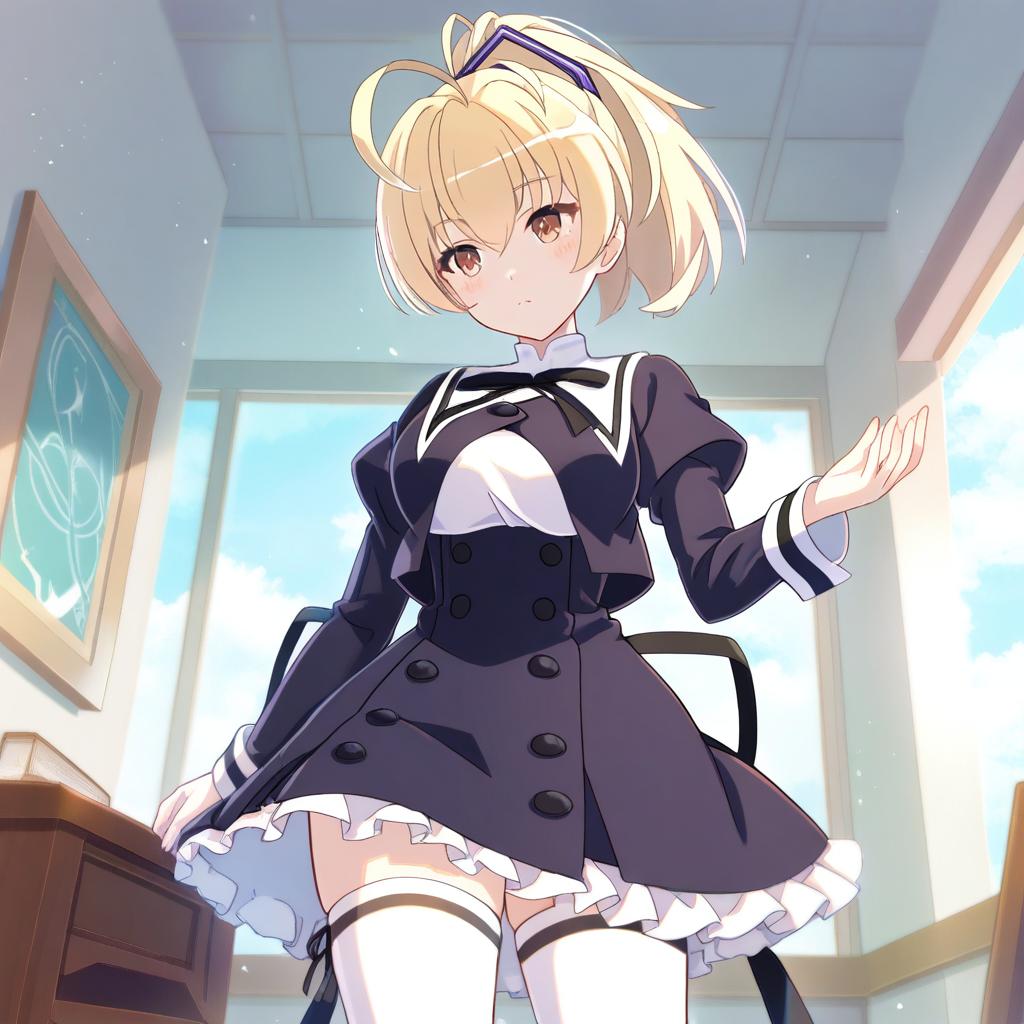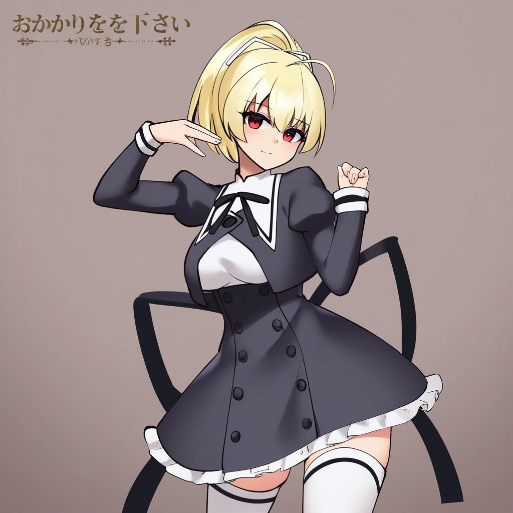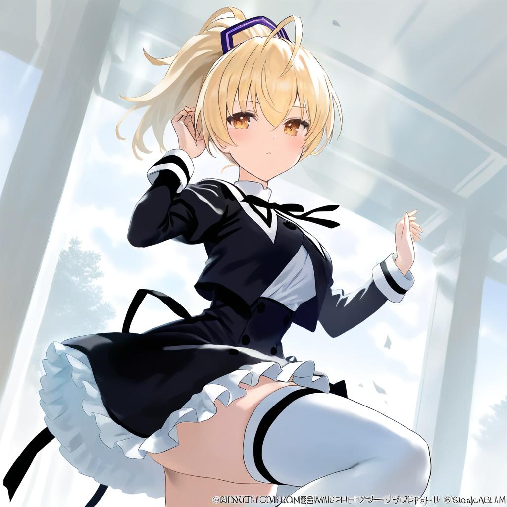 Andou tazusa, assault lily, 1girl, hand up, red eyes, hair between eyes, blonde hair, short hair, ponytail, ahoge, high ponytail, hair ribbon, medium breasts, yurigaoka girls academy school uniform, yurigaoka girls academy school uniform, cropped jacket, white shirt, black skirt, white thighhighs, high-waist skirt, frilled skirt, black ribbon, neck ribbon, juliet sleeves, miniskirt, buttons, by artist sakura oriko, animagine