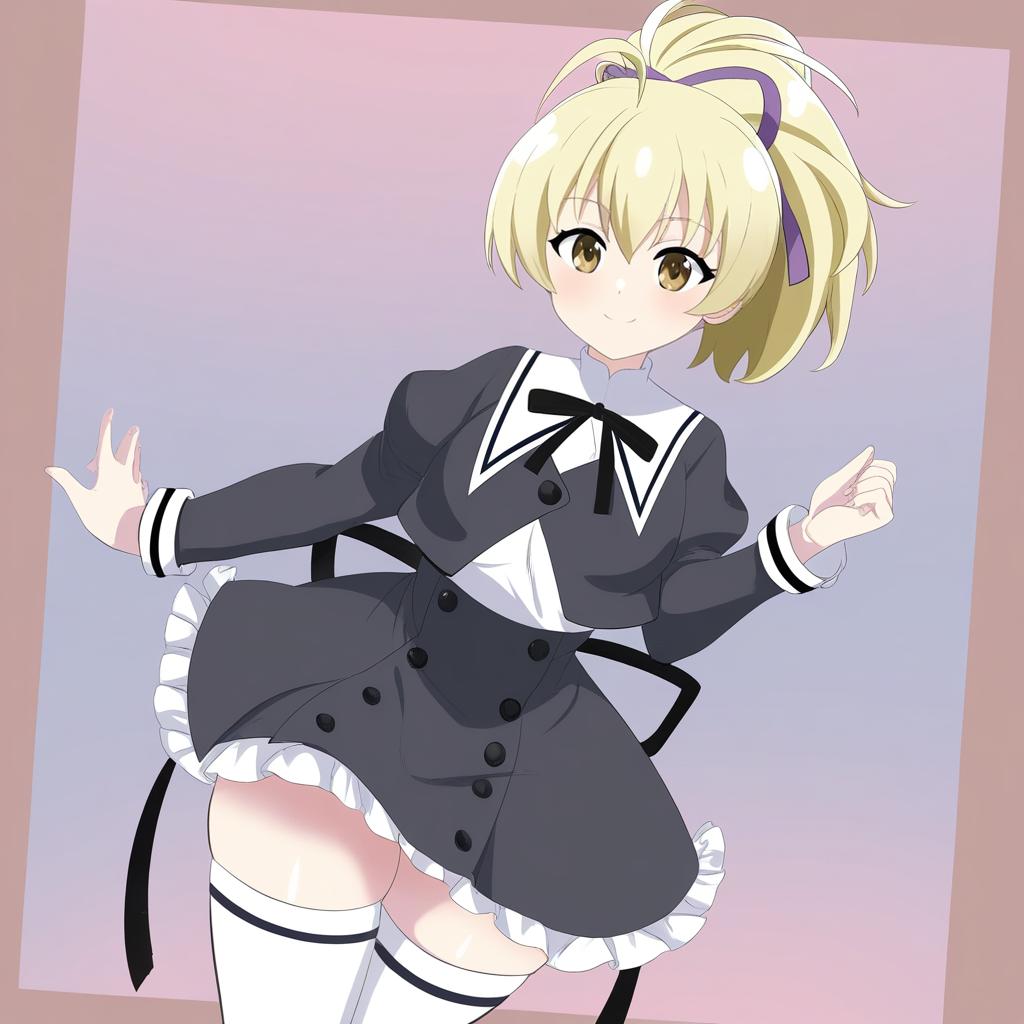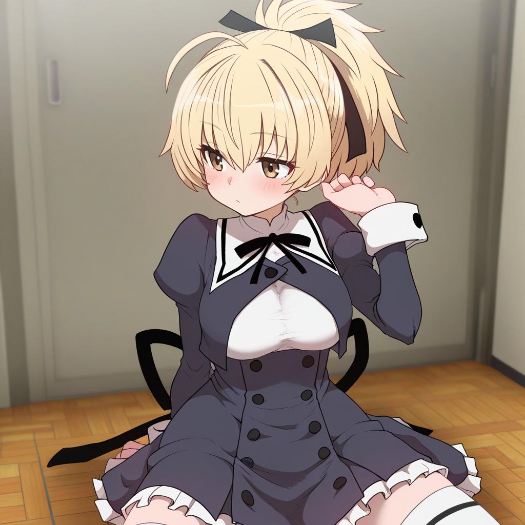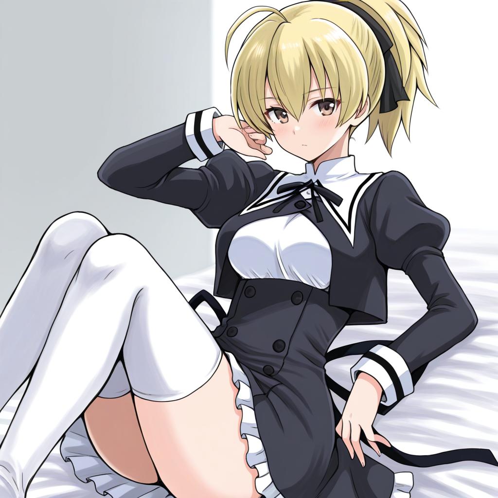 Andou tazusa, assault lily, 1girl, hand up, red eyes, hair between eyes, blonde hair, short hair, ponytail, ahoge, high ponytail, hair ribbon, medium breasts, yurigaoka girls academy school uniform, yurigaoka girls academy school uniform, cropped jacket, white shirt, black skirt, white thighhighs, high-waist skirt, frilled skirt, black ribbon, neck ribbon, juliet sleeves, miniskirt, buttons, by artist sakura oriko, animagine
