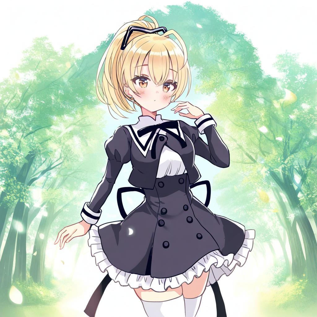 Digital illustration of a blonde anime girl with red eyes wearing the Yurigaoka Girls Academy school uniform. She has her hair styled in a high ponytail with a black hair ribbon and ahoge. The outfit includes a cropped jacket, white shirt, black high-waist skirt with buttons, frilled miniskirt, and white thigh-high stockings. The character is posed with one hand near her face and the other extended, set against a soft green forest background.